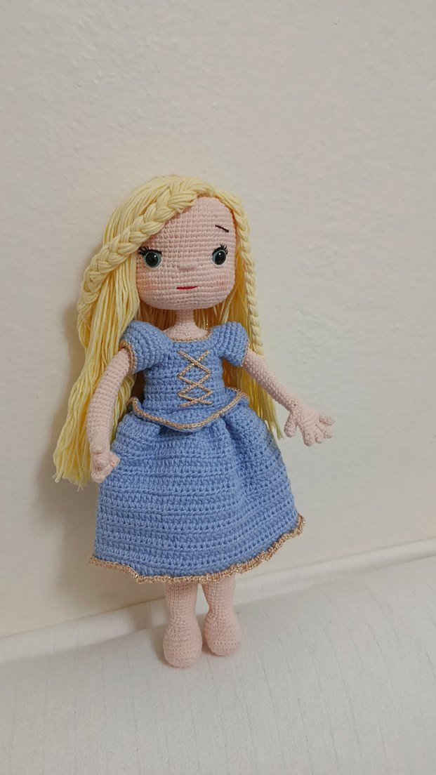 Pastel mavi el örgüsü bebek, uzun sarı ipten saçlara ve detaylı elbise dikişlerine sahiptir. saçları taranabilir herşekle girer elleri ayakları hareketli.kiyafetleri çıt çıtlı boyutu 40 cm