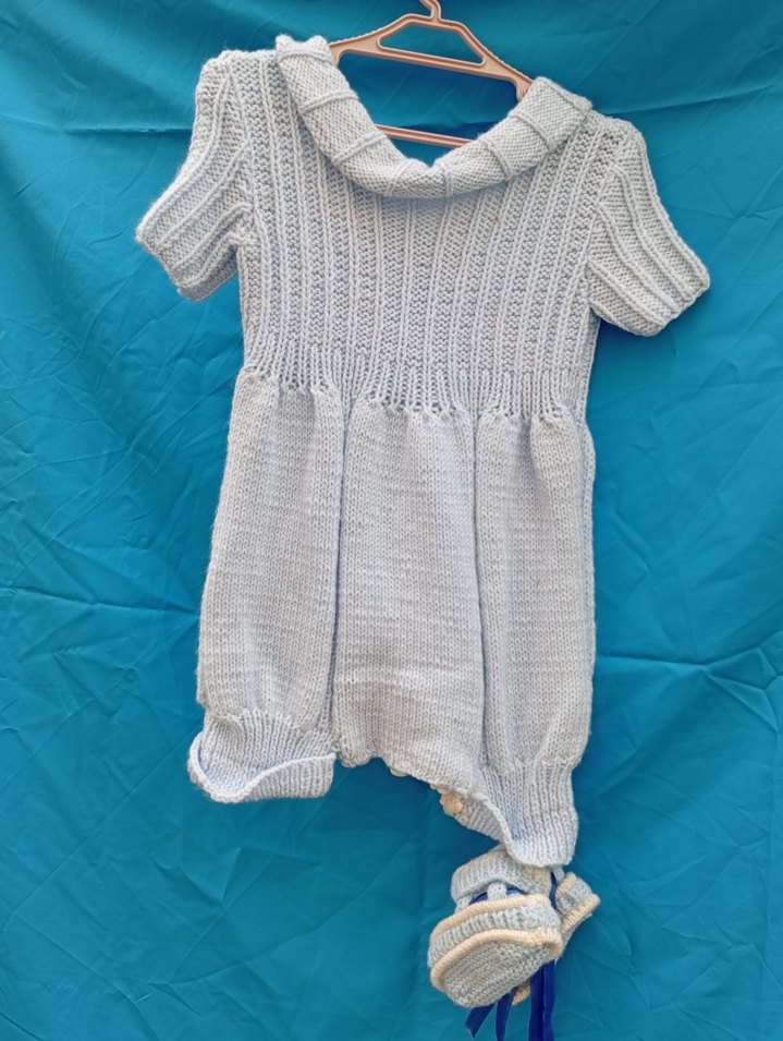 Mavi El Örgüsü Kısa Kollu Erkek bebek tulumu ve patiği.