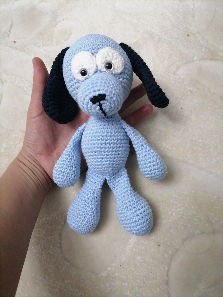 Renkli mavi, siyah kulaklı, ifade dolu gözlere sahip el örgüsü peluş oyuncak köpek. 20cm civar