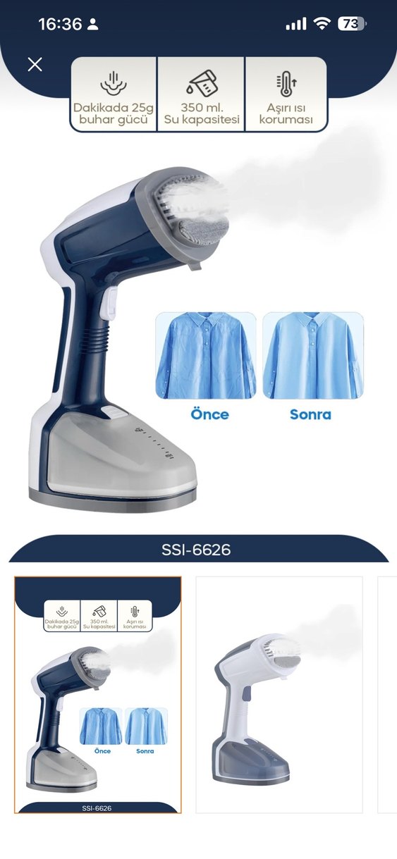 Mavi el tipi buharlı ütü SSI-6626, 25 saniyede buhar üretir, 350 ml su kapasitesine sahiptir ve kumaşı korur. Kullanılmadı, sağlam ürün kutusuyla göndereceğim.