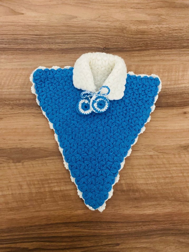 Mavi renkli, beyaz yakalı el yapımı banyo lifi, dokulu tasarımı ve renkli görünümüyle kullanışlıdır.