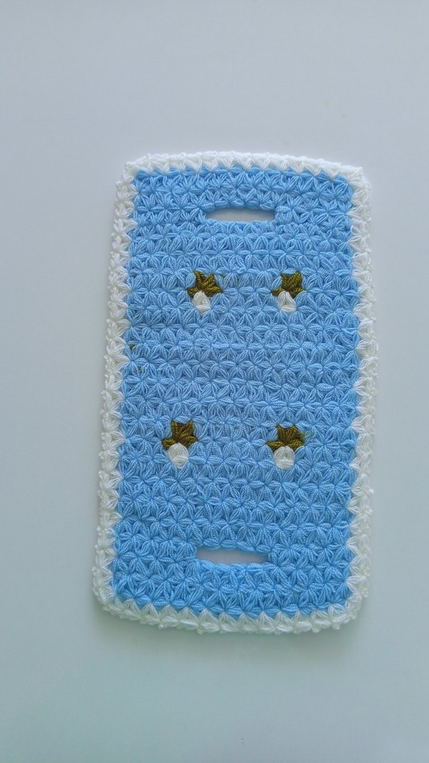 Pastel mavi renkli, küçük çiçek desenli ve tutma yerleri bulunan el yapımı banyo süngeri. Nazik temizlik için uygundur.