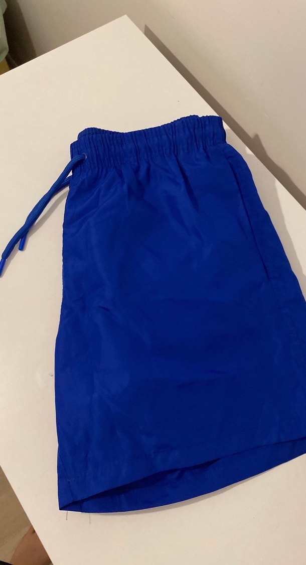 Parlak mavi renkte, elastik bel ve bağcıklı, bol kesim erkek mayo şortu. Rahat ve sade tasarımıyla plajda kullanıma uygundur.