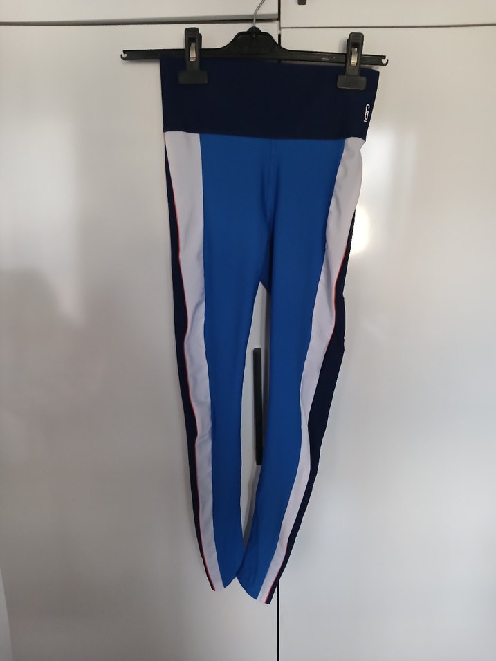 Elastik bel bantlı, koyu mavi ve beyaz renkli, normal boy kadın spor taytı. Esnek sentetik kumaştan üretilmiştir, spor ve günlük kullanıma uygundur. ♀️