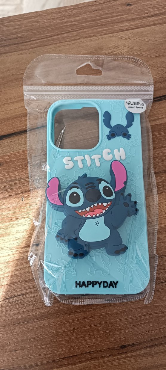 Mavi elastik yanlara sahip, 3D Stitch figürlü telefon kılıfı. Kabartmalı desenler ve 'HAPPYDAY' yazısı bulunur. Pastel pop kültür tarzı.