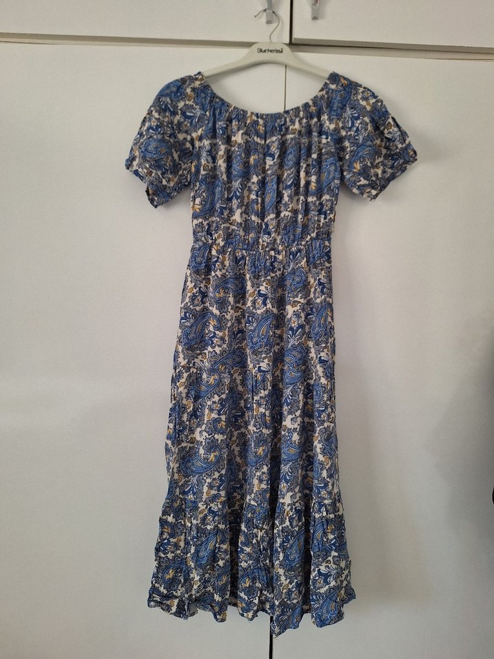 Bol kesim bohem elbise, kısa kollu ve fırfır detaylıdır. Askısız yaka ve mavi-gri batik desenlidir, günlük kullanıma uygundur. beden yazmıyor s-m uyumlu