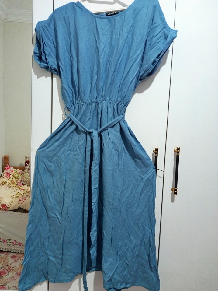 Mavi, belden lastikli ve kemerli günlük elbise. Hafif ve rahat bir kumaşa sahiptir. Yaz ve bahar aylarında rahatlıkla kullanılabilir. Temiz ve iyi durumdadır, herhangi bir yırtık ya da leke yoktur.