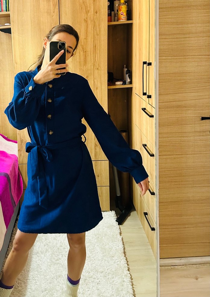 Trendyol 34 beden mavi elbise Omuzdan eteğe 86 cm bel genişlik 45 cm kuşaklı kışlık elbise. Hiç giyilmedi