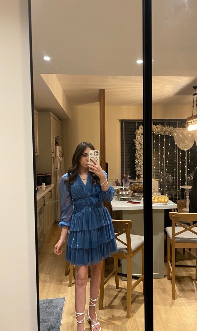 V yaka ve uzun kollu simli, dar kesim elbise.