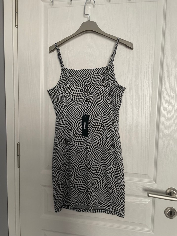 Askılı kolları ve V yakası olan, kareli siyah-gri desende, tokalı detaylı, sentetik kumaştan yapılmış, vücuda oturan midi elbise. Günlük sokak stiline uygun.