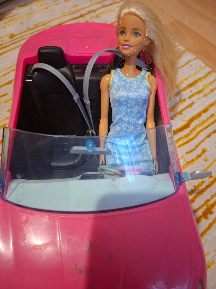 Mavi elbiseli sarı saçlı bebek, pembe oyuncak arabanın içinde oturuyor. Arabanın şeffaf ön camı ve siyah koltukları var.