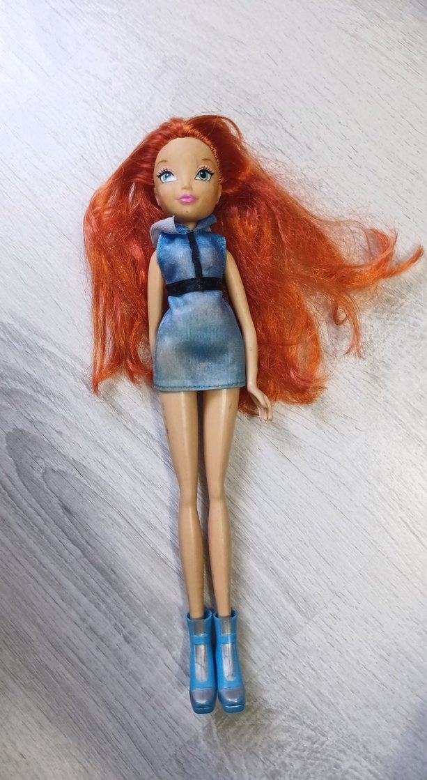 Canlı kırmızı saçlı, mavi elbiseli ve mavi ayakkabılı bebek. Detaylı yüz ifadesine sahip renkli oyuncak.