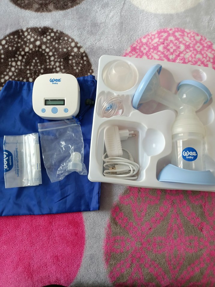 Dijital ekranlı, mavi renkli elektronik göğüs pompası, güç adaptörü ve aksesuarları ile birlikte, saklama poşetleri ve taşıma çantası dahildir.