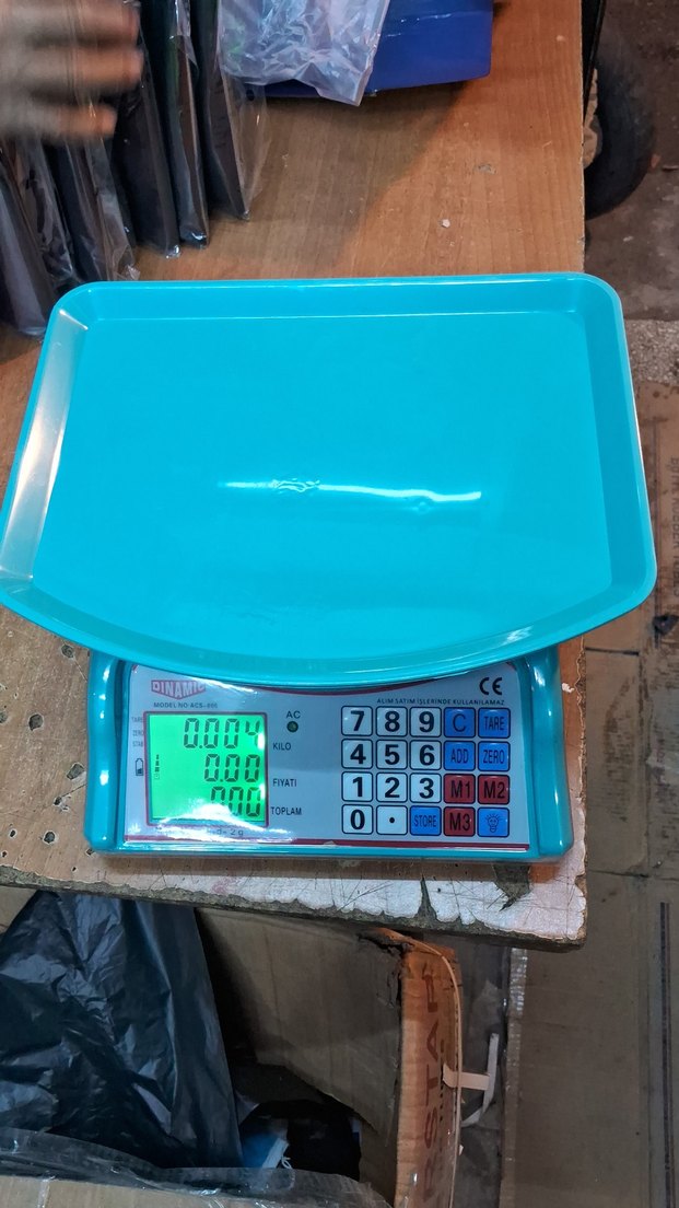 Mavi renkli elektronik terazi, dijital ekran ve tuş takımı ile hassas tartım yapar. Düz bir tartım platformuna sahiptir. ⚖️
