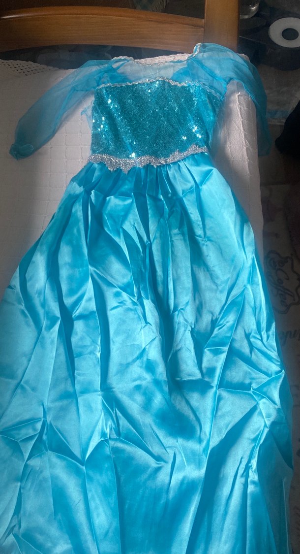 Mavi elsa kostümü, parlak sentetik kumaştan ve drapeli tasarıma sahip, pop kültür stiline uygun. ✨