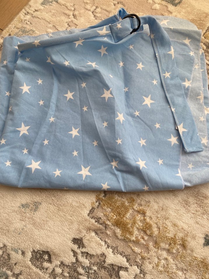 Pastel mavi, beyaz yıldız desenli çocuk uyku perdesi, yumuşak sentetik kumaştan üretilmiştir. Askı için halkası mevcuttur.