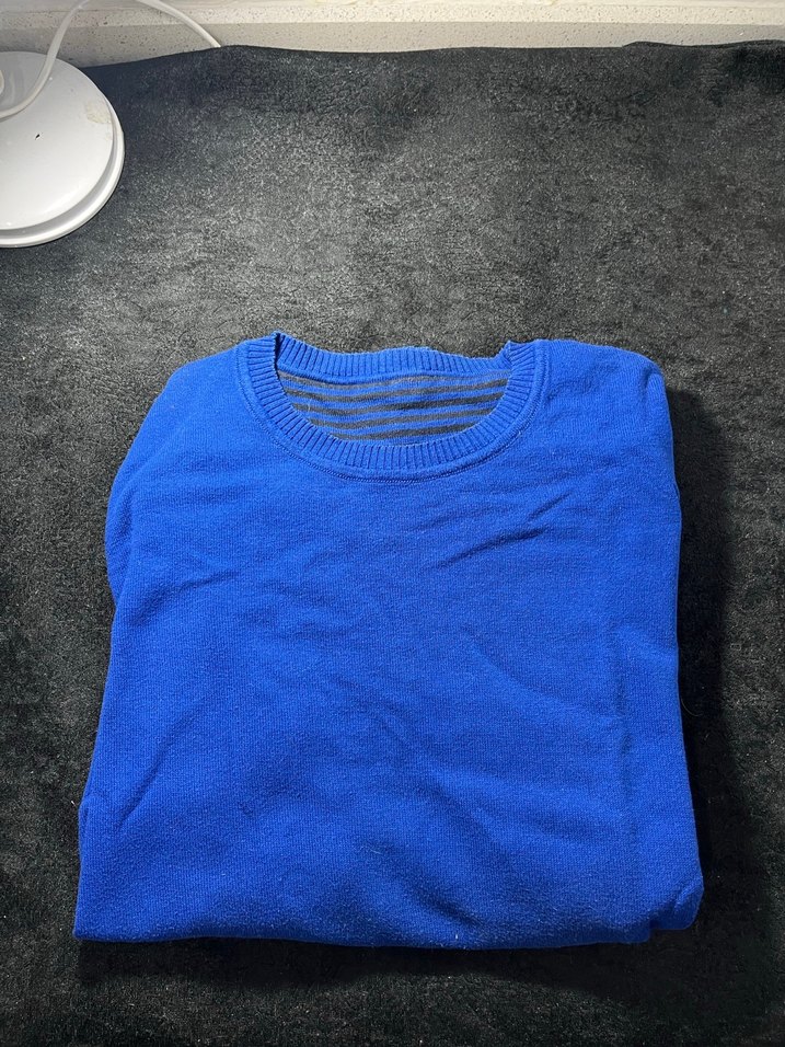 Mavi renkli, bisiklet yaka ve uzun kollu erkek sweatshirtü. Yumuşak örme kumaştan, günlük sokak stili için uygun rahat bir parça.