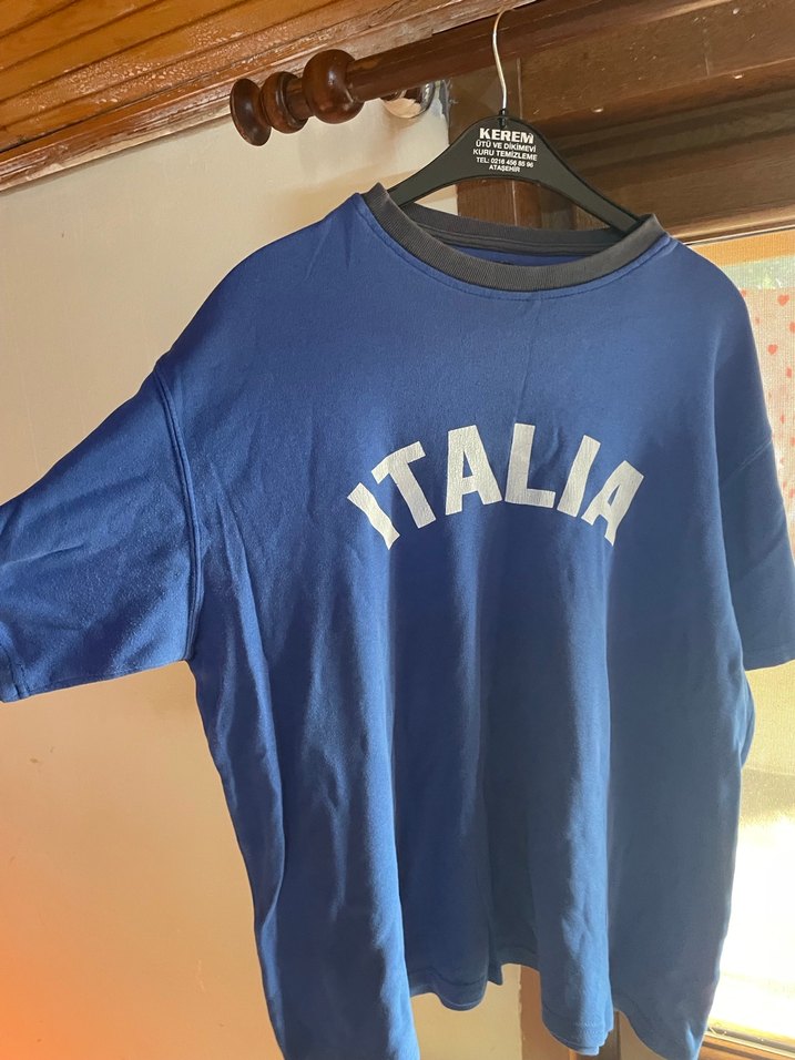 Mavi pamuklu kumaştan, bol kesim, uzun kollu, bisiklet yaka, "ITALIA" baskılı erkek tişörtü.