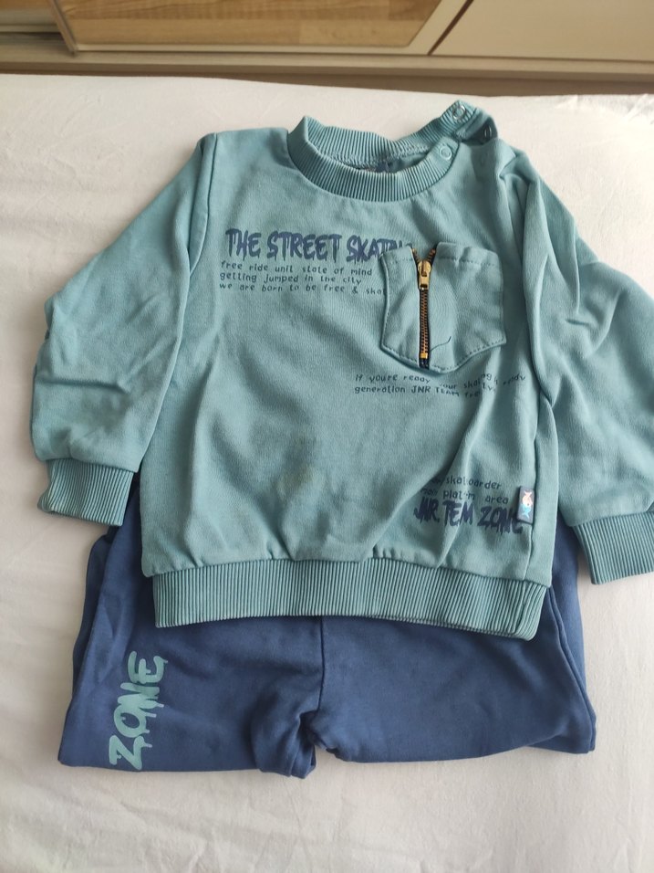 Pastel mavi uzun kollu, bisiklet yaka, sweatshirt ve baskılı eşofman oluşan erkek bebek takımı. Yumuşak ve rahat kumaş kullanılmış. ufak bi lekesi var