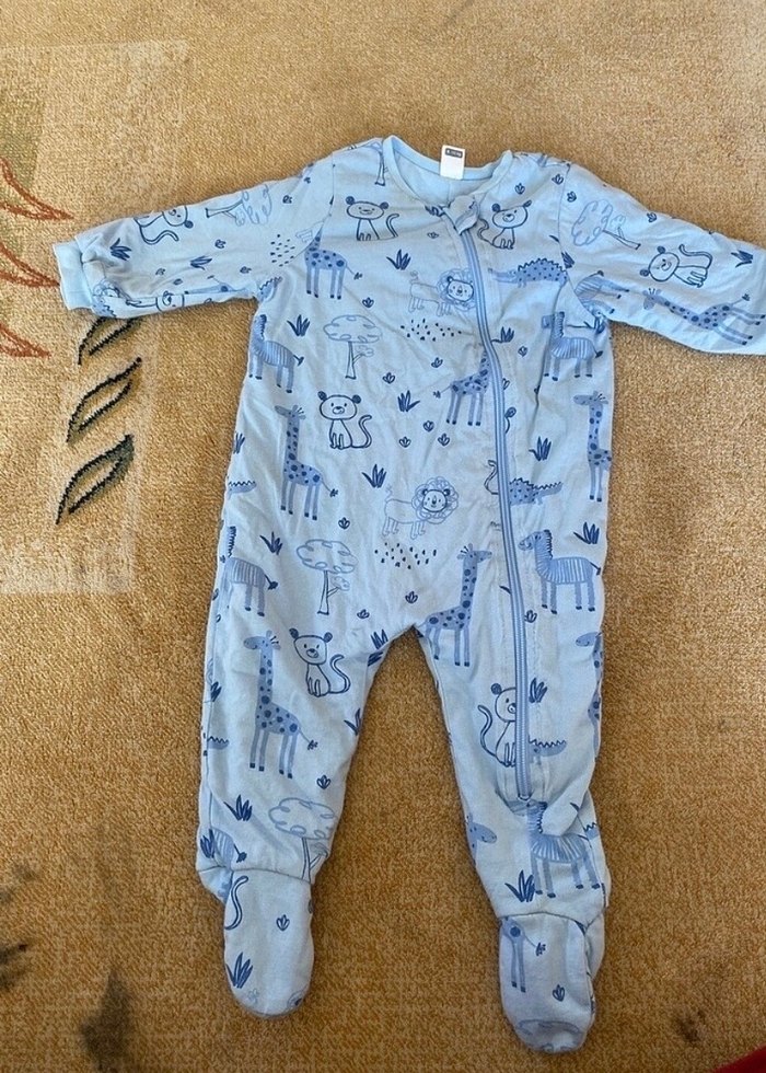 Mavi renkli erkek bebek tulumu uzun kollu, yüksek yakalı ve fermuarlıdır. Yumuşak ve sıcak kumaştan üretilmiş, hayvan desenleri bulunur ve ayakları kapalıdır. 6-12 ay
