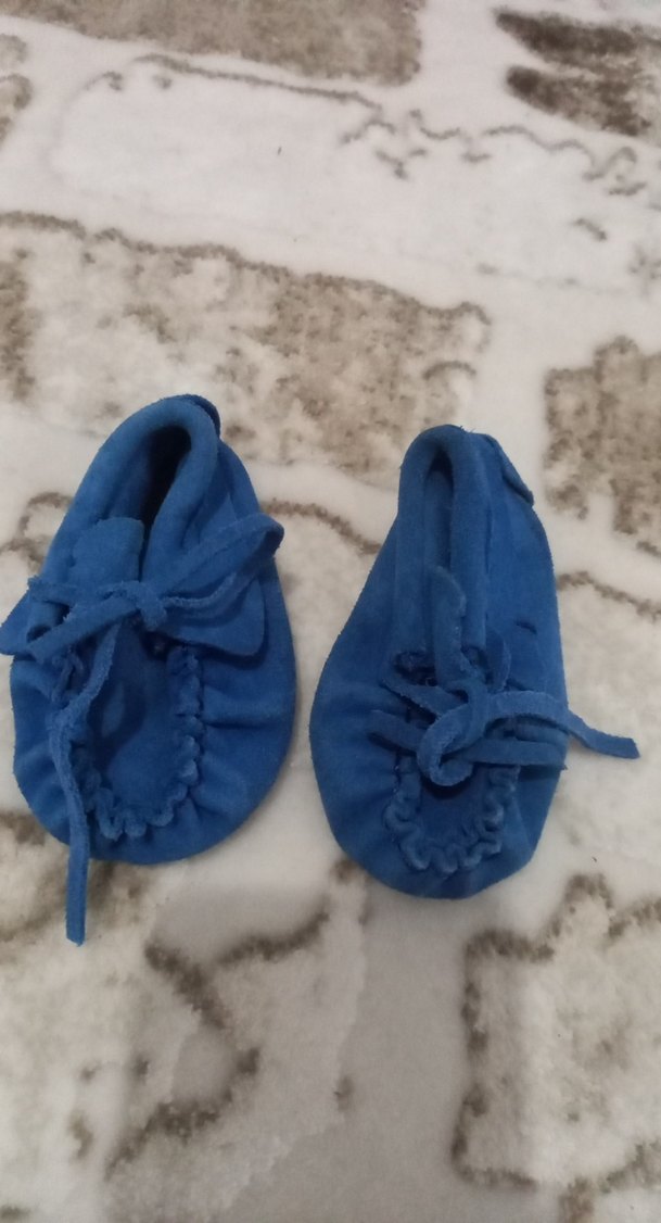 Yumuşak mavi kumaştan, kenarında fırfır detaylı bohem tarzda erkek bebek patikleri. Rahat ve sade tasarım.