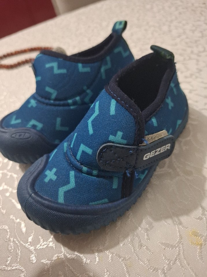 Mavi renkli, renkli desenli, cırt cırtlı erkek bebek ilk adım ayakkabısı. Dayanıklı kauçuk tabanlı. Marka: GEZER.