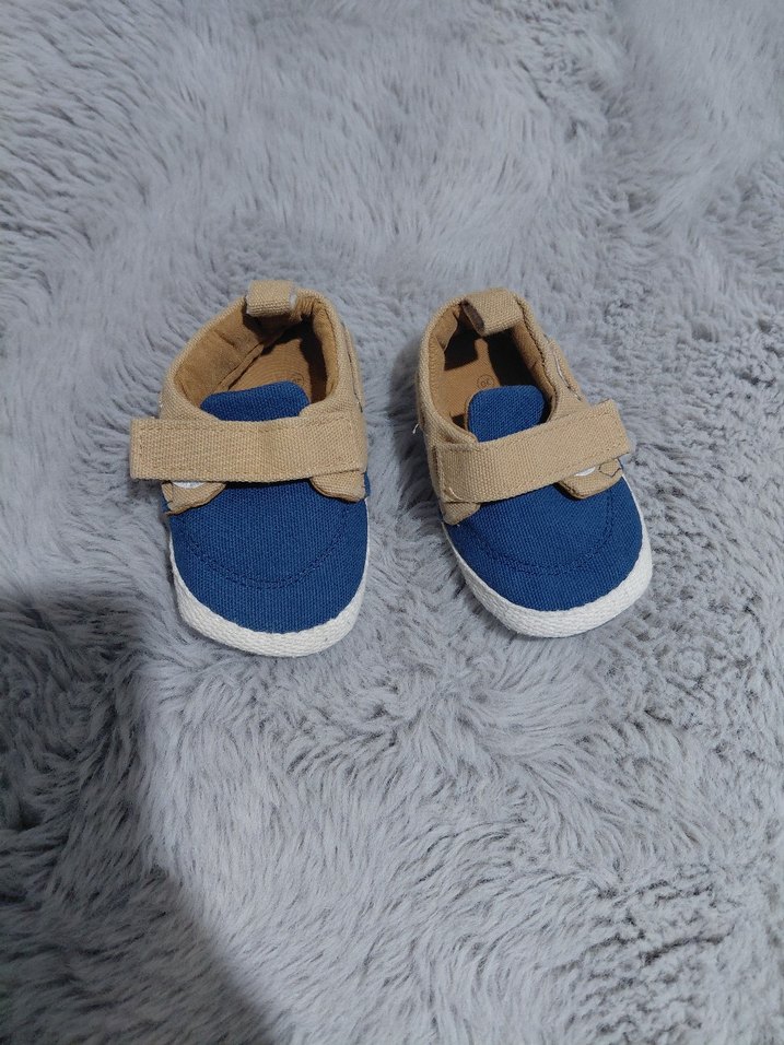 Mavi renkli, cırt cırtlı ve kauçuk tabanlı erkek bebek ilk adım ayakkabısı, bağlama desenli ve sade sokak stiliyle. hiç kullanılmadı sayılır