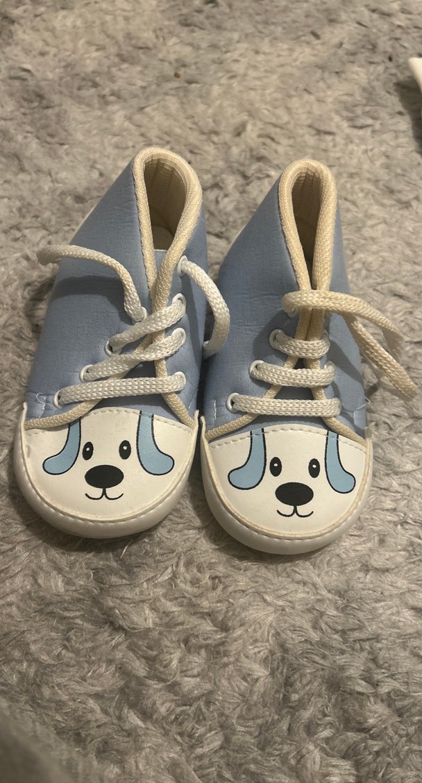 Pastel mavi renkli, burun kısmında nakış köpek figürlü, kürk detaylı ve kauçuk tabanlı erkek bebek ilk adım ayakkabısı.