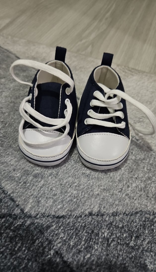 Mavi, kaymaz tabanlı erkek bebek ilk adım ayakkabısı, Velcro bantlı rahat ve sade tasarım. almanyadan geldi denedim bebeğimin ayağına girmedi bile sıfır üründür. numara tahmini yazdım ama 16 17 olur