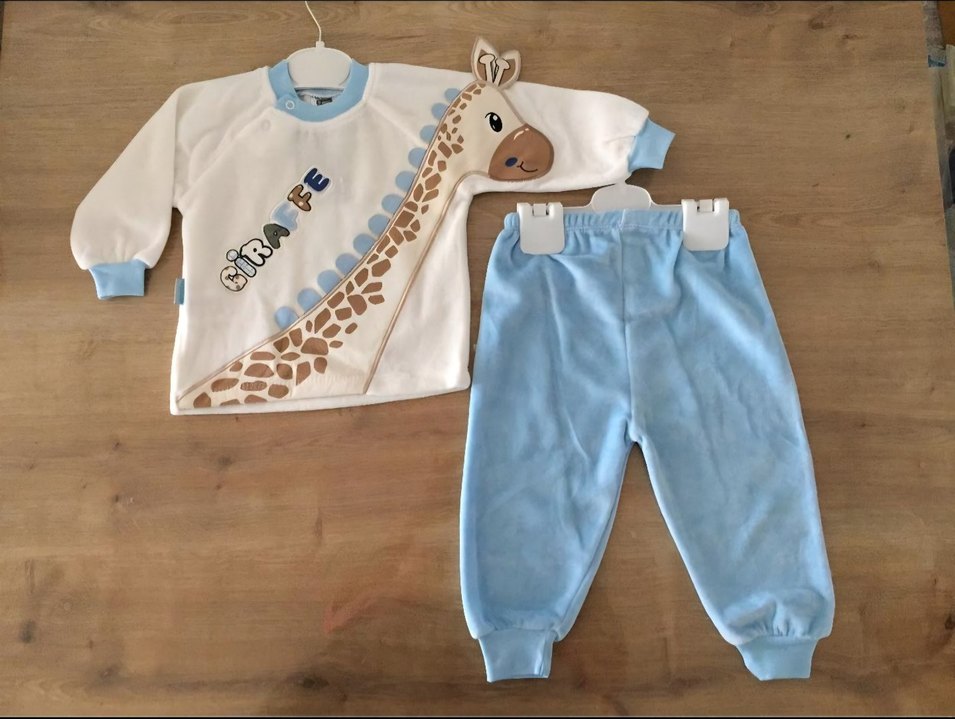 Uzun kollu, bisiklet yaka, kadife dokulu ve baskılı zürafa desenli üst ile pastel mavi yumuşak polar pantolonlardan oluşan erkek bebek takımı. sifir etiketli 9-12 ay