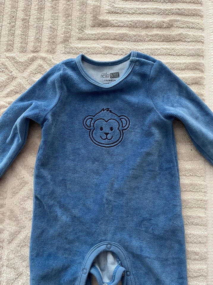 Mavi renkli, uzun kollu, yuvarlak yakalı, önünde maymun baskısı olan yumuşak kadife bebek tulumu.