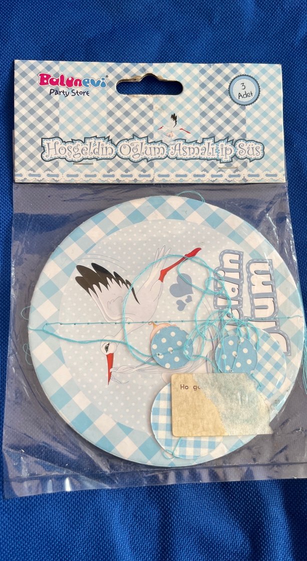 Pastel mavi renkte, leylek figürlü bebek karşılama süsü. Üç adetli pakette, yeni doğan erkek bebek kutlamaları için uygun.