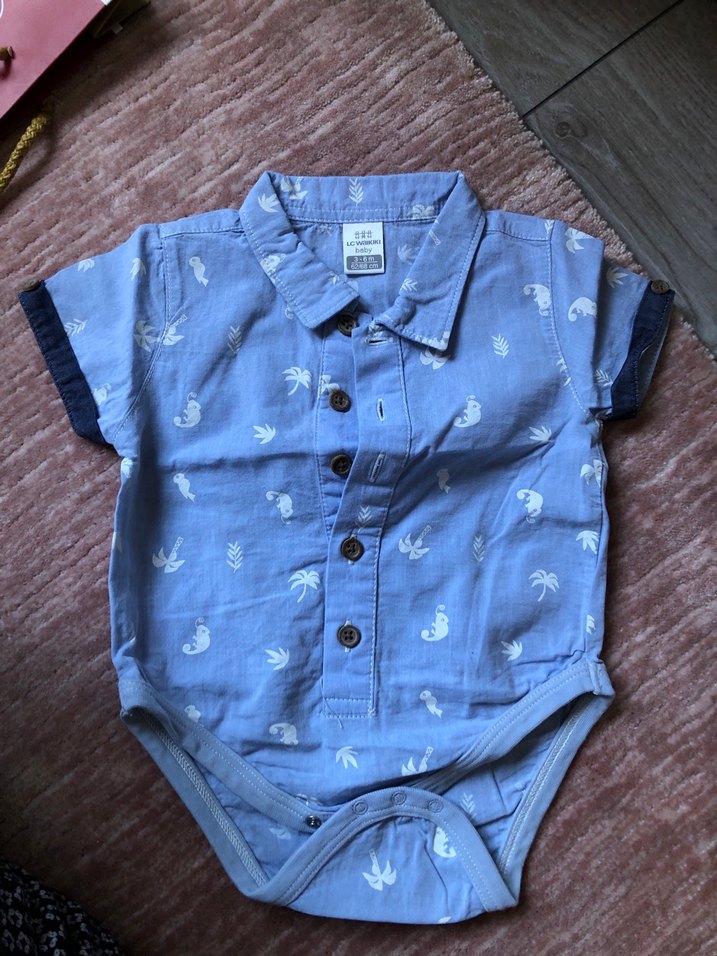 Kısa kollu, yakalı ve düğmeli mavi erkek bebek body. Yumuşak denim görünümlü kumaştan, pastel tonlarda ve sokak stiliyle.