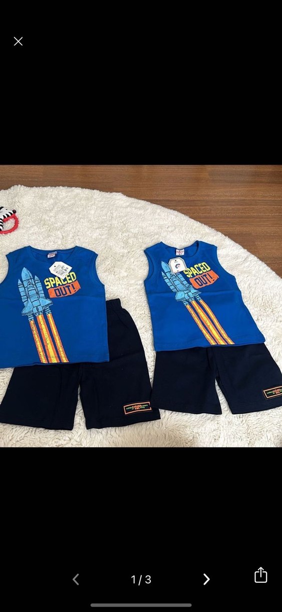 Mavi kolsuz üst, renkli roket baskılı ve askısız yakalı, siyah velcro kapamalı şortlarla kombinlenmiş bebek erkek takım. Yumuşak ve sıcak hissettirir. 4 yaş ve adet fiyatıdır.