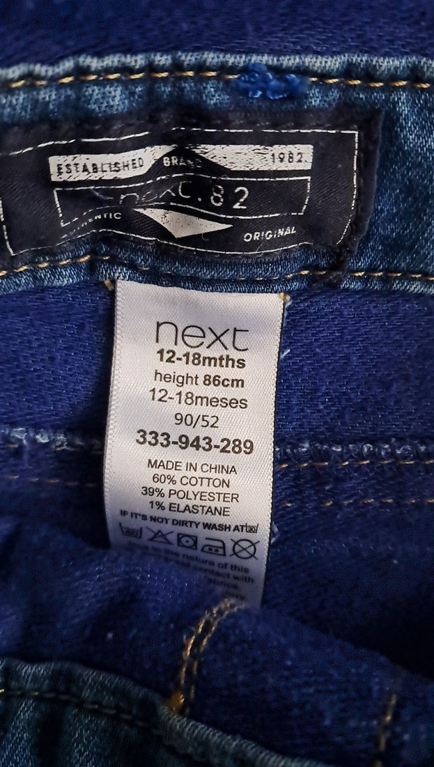 60% pamuk, 39% polyester ve 1% elastan karışımı mavi kot kumaştan yapılmış, 12-18 ay arası 86 cm boy bebekler için uygun erkek kot pantolon. Çin'de üretilmiştir.