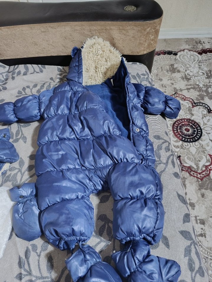 Mavi renkte, kapüşonunda kürk detayı bulunan, yumuşak ve sıcak kumaştan erkek bebek tulumu. Sokak modasına uygun sade tasarım. ❄️