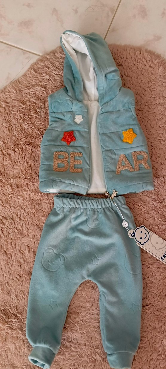 Mavi renkli, kürklü detaylı, nakışlı yıldız desenli, kapüşonlu yelek ve lastikli pantolondan oluşan erkek bebek takımı.