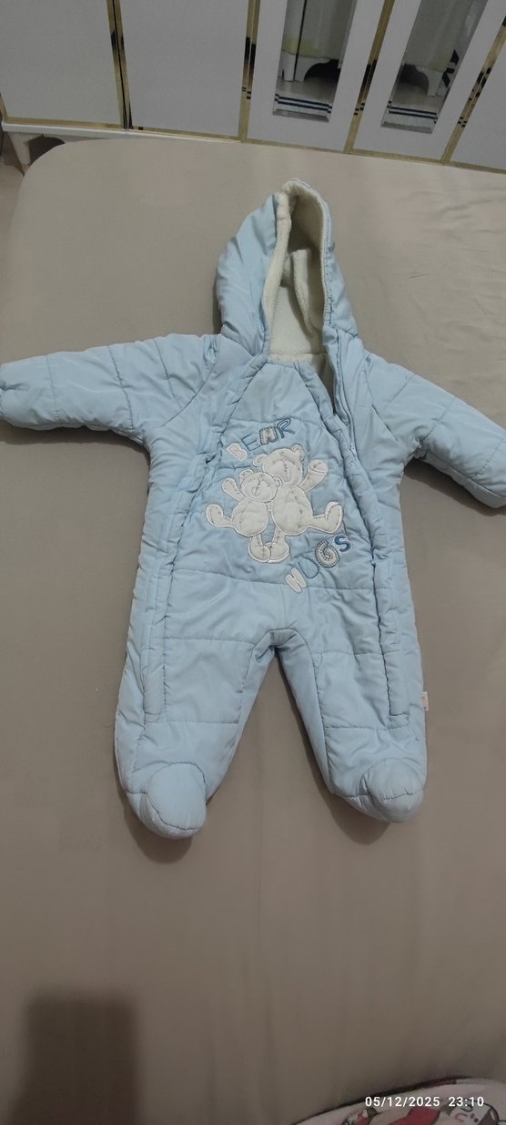 Pastel mavi erkek bebek tulumu, triko dokuma ve nakışlı desenlere sahiptir. Yumuşak ve sıcak kumaştan üretilmiştir, kapüşonlu ve ayaklıdır. Soğuk havalar için uygundur. ❄️