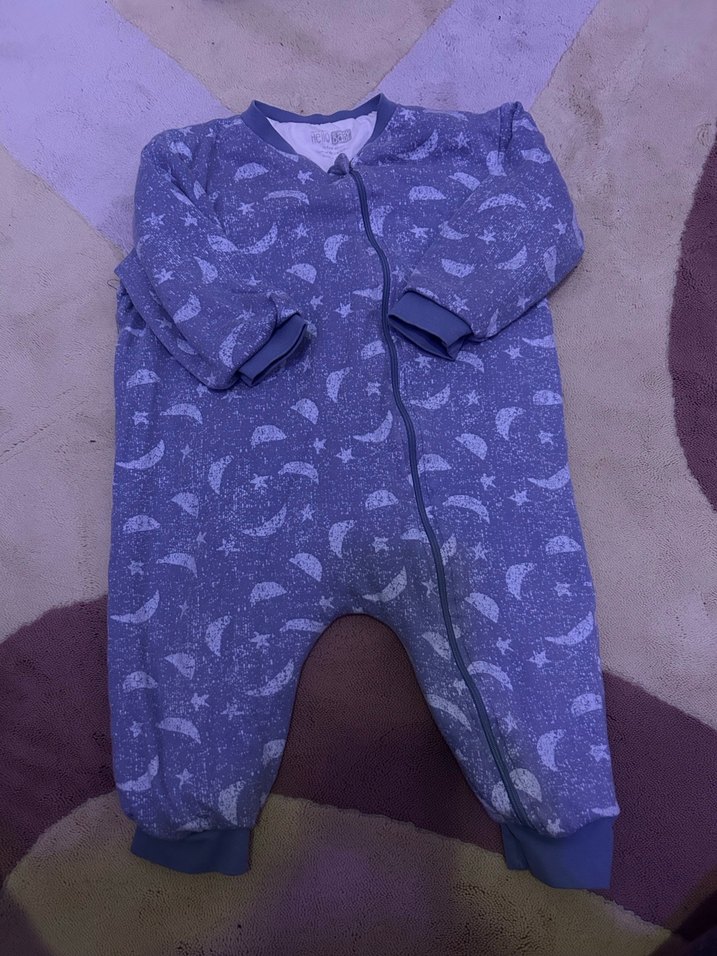 Mavi renkli, örgü dokulu erkek bebek tulumu uzun kollu ve bisiklet yaka tasarıma sahiptir. Yumuşak ve sıcak kumaştan üretilmiştir, önden fermuarlıdır.