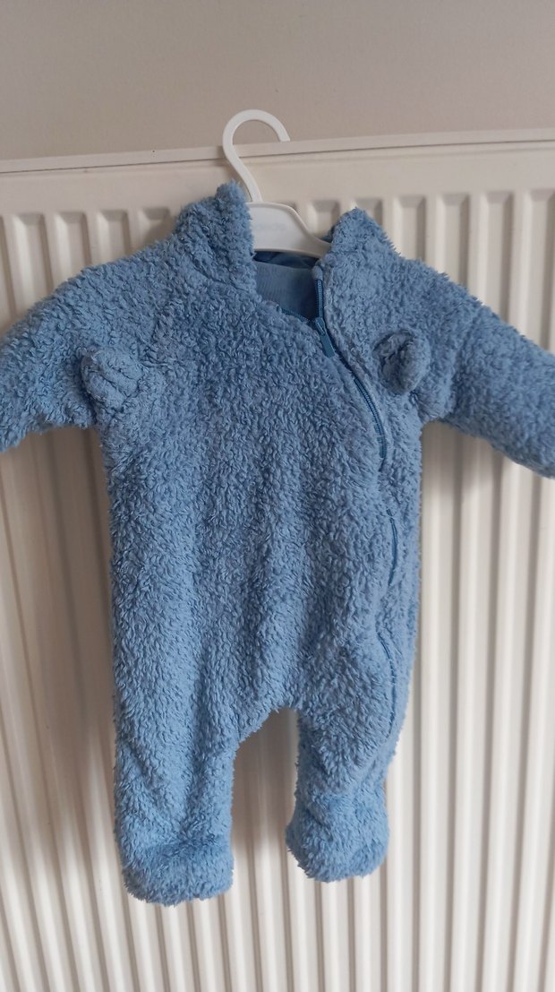 Mavi renkli, örgü dokulu yumuşak kumaştan yapılmış erkek bebek tulumu. Fermuarlı ve tüm vücudu kaplayan sıcak tutan model.