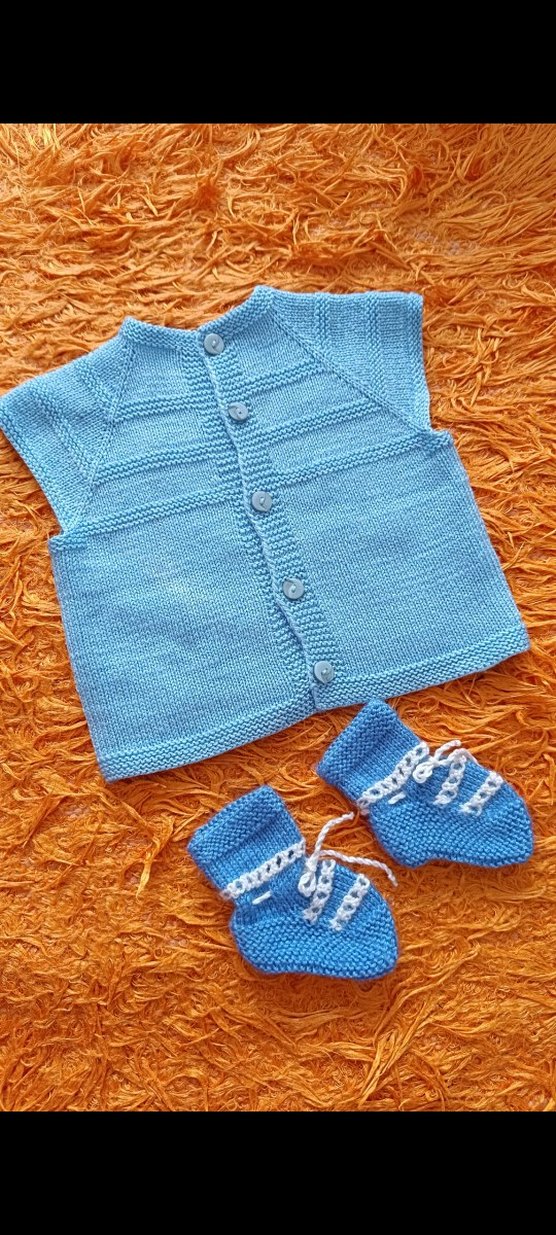 Düğmeli, bisiklet yaka, mavi örgü yelek ve uyumlu patiklerden oluşan renkli erkek bebek seti. Yumuşak ve rahat dokunuşlu.