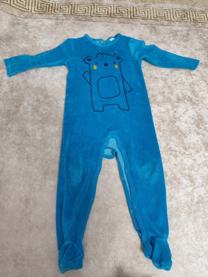 Mavi renkli, uzun kollu ve yuvarlak yakalı erkek bebek tulumu, yumuşak ve sıcak kumaştan örülmüş, renkli hayvan figürü içerir. hiç kullanılmadı