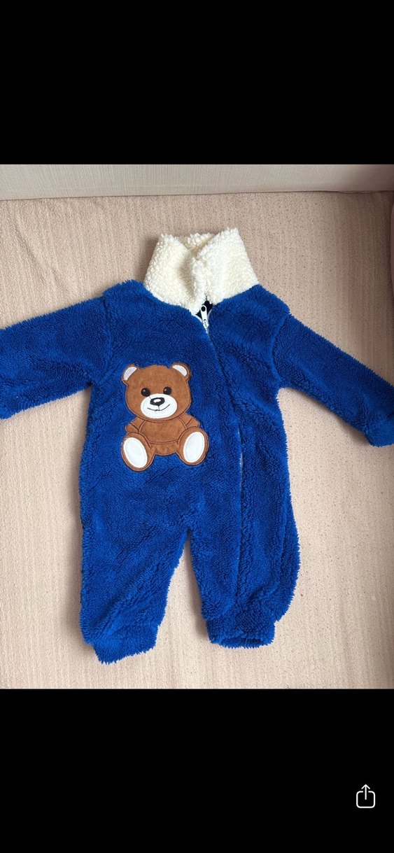 Mavi renkli erkek bebek tulumu, yumuşak ve sıcak kumaş ile kürk detaylara sahip. Önünde sevimli ayı figürü bulunur, fermuarlı ve rahat yakalıdır.