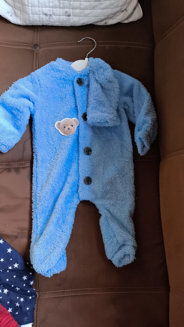 Yumuşak ve sıcak kumaştan yapılmış, düğmeli ve ayıcık aplikeli pastel mavi erkek bebek tulumu. Sokak stili için uygundur.