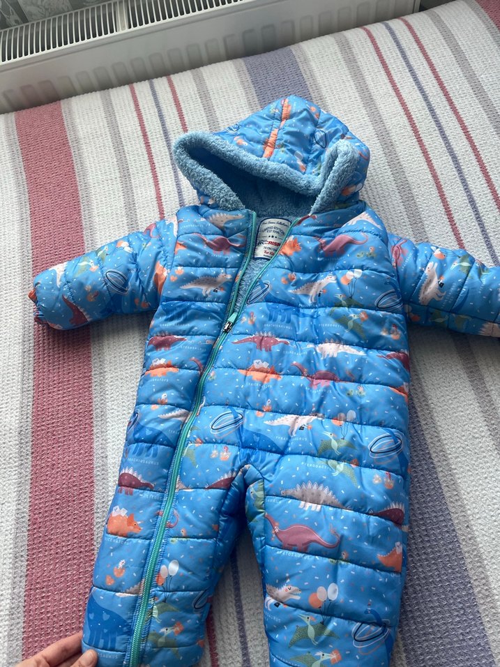 Mavi renkli erkek bebek tulumu, yumuşak polar astar ve kolay giydirme için fermuarlı ön kısma sahiptir. Sokak stili ve hafif dinozor desenlidir.