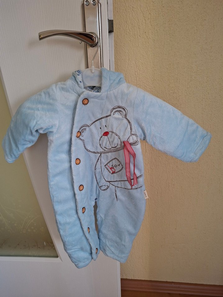Yumuşak polar kumaştan yapılmış, renkli nakışlı ayı deseni bulunan mavi erkek bebek tulumu. Önden düğmeli ve sokak tarzında.