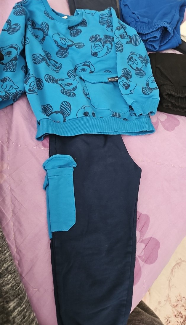 Mavi uzun kollu sweatshirt ve koyu mavi pantolondan oluşan erkek bebek takımı. Sweatshirt üzerinde eğlenceli desen ve cırt cırtlı cep bulunur, yumuşak ve sıcak kumaştan üretilmiştir. etiket 6 yas yaziyor 4-5 yas daha uygun