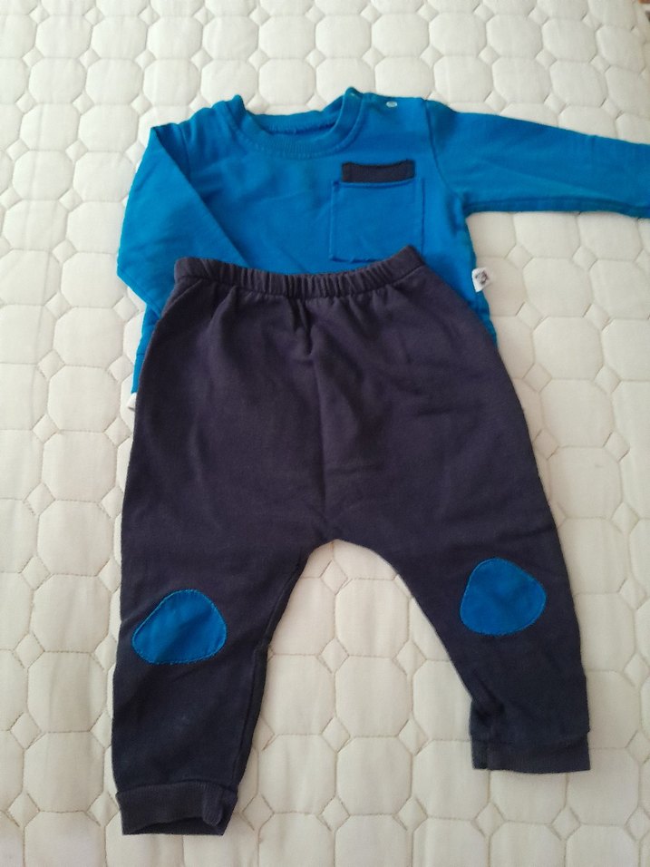 Uzun kollu mavi üstü düğmeli ve ön cepli, koyu renk pantolonları mavi diz yamasıyla tamamlanmış, sadecee yaka kısmında hafif bi iz var ama dikkatli bakınca belli oluyor ekledim resmini