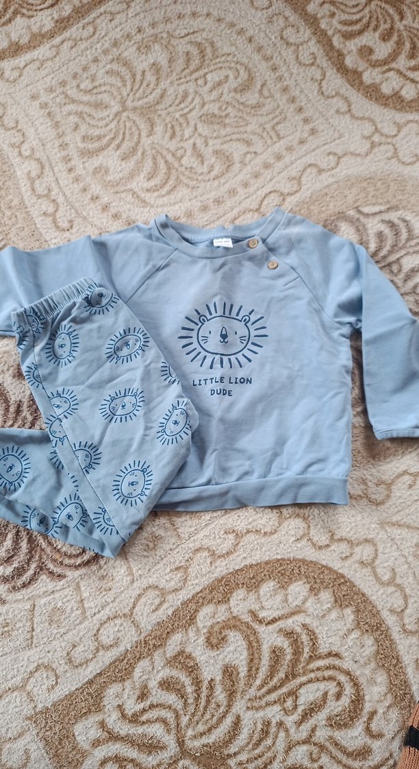 Mavi tonlarında, uzun kollu, triko detaylı ve yumuşak kumaştan yapılmış erkek bebek takımı. Üzerinde 'Little Lion Dude' yazılı aslan baskısı bulunur. çok minik bir lekesi var son fotoğrafda koydum