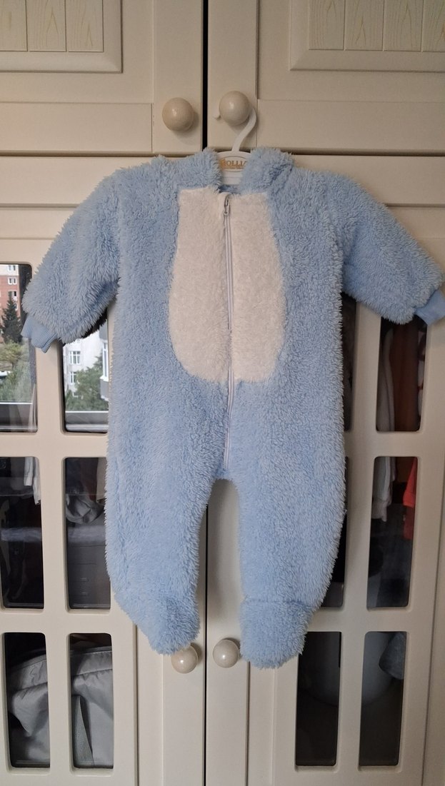 Pastel mavi renkte, önü fermuarlı, yumuşak ve triko dokulu erkek bebek tulumu. Küçükleri sıcak tutar. ❄️